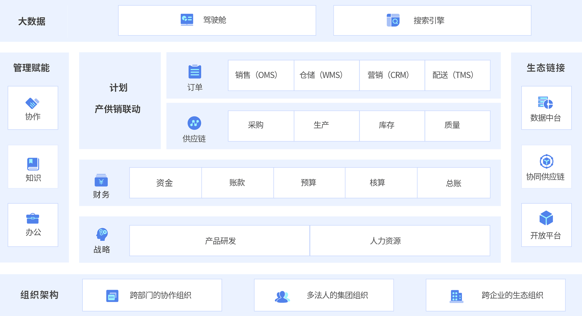 一站式满足企业全面管理所需,告别烟囱式的企业信息化建设。
